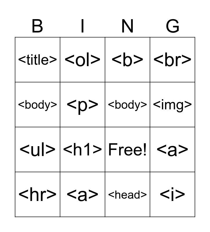 This bingo card has 21 words: <a>, <h6>, <ol>, <h1>, <head>, <body>, <title>, <b>, Free!, <img>, <ul>, <br>, <i>, <hr>, <p>, <li>, <hr>, <h1>, <body>, <a> and <title>.