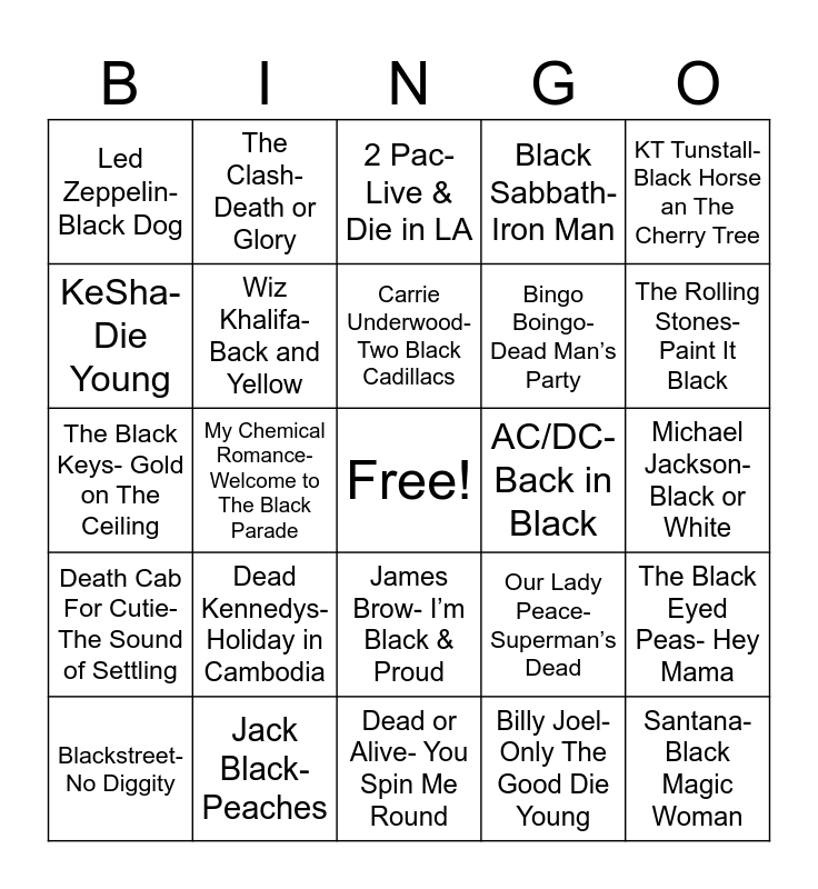 This bingo card has a free space and 27 words: Our Lady Peace- Superman’s Dead, Jan and Dean- Dead Man’s Curve, Bingo Boingo- Dead Man’s Party, Dead or Alive- You Spin Me Round, KeSha- Die Young, 2 Pac- Live & Die in LA, The Clash- Death or Glory, Death Cab For Cutie- The Sound of Settling, AC/DC- Back in Black, The Black Eyed Peas- Hey Mama, The Black Keys- Gold on The Ceiling, Black Sabbath- Iron Man, Blackstreet- No Diggity, Jack Black- Peaches, The Rolling Stones- Paint It Black, Will Smith- Men In Black, Wiz Khalifa- Back and Yellow, Carrie Underwood- Two Black Cadillacs, Dead Kennedys- Holiday in Cambodia, Led Zeppelin- Black Dog, Michael Jackson- Black or White, Billy Joel- Only The Good Die Young, My Chemical Romance- Welcome to The Black Parade, Santana- Black Magic Woman, James Brow- I’m Black & Proud, KT Tunstall- Black Horse an The Cherry Tree and The Grateful Dead- Touch of Gray.