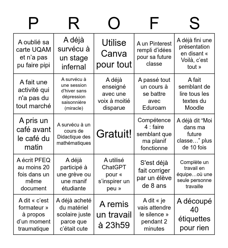 This bingo card has a free space and 24 words: A déjà participé à une grève ou une manif étudiante, A déjà acheté du matériel scolaire juste parce que c’était cute, A déjà enseigné avec une voix à moitié disparue, A dit « c’est formateur » à propos d’un moment traumatique, A déjà fini une présentation en disant « Voilà, c’est tout », A oublié sa carte UQAM et n’a pas pu faire pipi, A fait une activité qui n'a pas du tout marché, A déjà survécu à un stage infernal, Compétence 4 : faire semblant que ma planif fonctionne, A utilisé ChatGPT pour « s’inspirer un peu », A passé tout un cours à se battre avec Eduroam, A pris un café avant le café du matin, S'est déjà fait corriger par un élève de 8 ans, Complète un travail en équipe…où une seule personne travaille, A survécu à une session d’hiver sans dépression saisonnière (miracle), A dit « je vais attendre le silence » pendant 2 minutes, A déjà dit “Moi dans ma future classe…” plus de 10 fois, Utilise Canva pour tout, A fait semblant de lire tous les textes du Moodle, A survécu à un cours de Didactique des mathématiques, A découpé 40 étiquettes pour rien, A écrit PFEQ au moins 20 fois dans un même document, A un Pinterest rempli d’idées pour sa future classe and A remis un travail à 23h59.