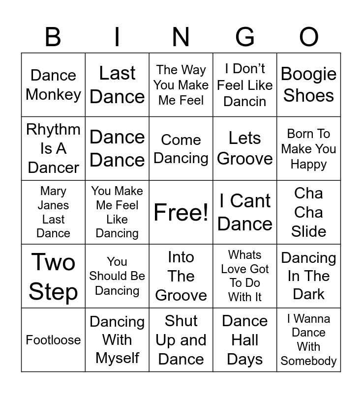 This bingo card has a free space and 50 words: Dancing Queen, I Wanna Dance With Somebody, Just Dance, Shut Up and Dance, You Should Be Dancing, Dance The Night, Last Dance, Dance To The Music, Rhythm Is A Dancer, Lets Dance, Dance Dance, I Don’t Feel Like Dancin, Dancing In The Dark, Whats Love Got To Do With It, Dancing On My Own, Dancing With A Stranger, Come Dancing, I Cant Dance, Dance With Me, Boogie Shoes, You Make Me Feel Like Dancing, Dance Hall Days, Dance Monkey, Lets Groove, Gonna Make You Sweat, Dancings Not A Crime, Born To Make You Happy, Don’t Stop The Music, The Way You Make Me Feel, Into The Groove, All She Wants To Do Is Dance, Cant Stop The Feeling, Let It Whip, Magic Dance, Dancing With Myself, The Anthem, Dancing On The Ceiling, Dance With Somebody, Save The Last Dance For Me, Cha Cha Slide, Cupid Shuffle, Y.M.C.A., The Safety Dance, Macarena, Footloose, Mary Janes Last Dance, I Hope You Dance, Better When I'm Dancing, Two Step and And We Danced.