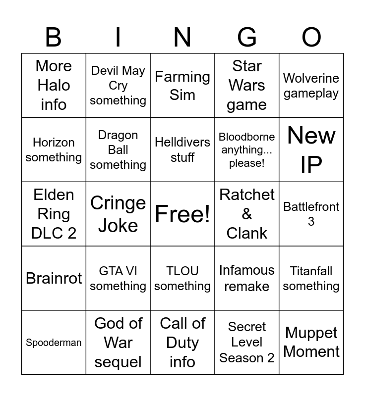 This bingo card has a free space and 24 words: GTA VI something, God of War sequel, Helldivers stuff, Spooderman, Wolverine gameplay, More Halo info, Horizon something, Devil May Cry something, Ratchet & Clank, TLOU something, Bloodborne anything... please!, Elden Ring DLC 2, Infamous remake, Titanfall something, Dragon Ball something, Secret Level Season 2, Battlefront 3, Farming Sim, New IP, Cringe Joke, Muppet Moment, Brainrot, Star Wars game and Call of Duty info.