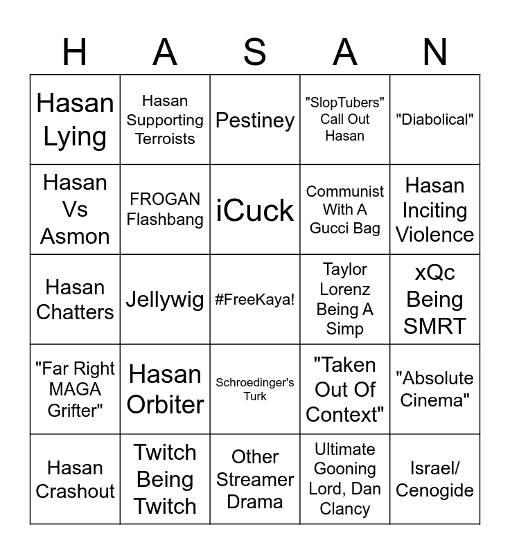 This bingo card has a free space and 24 words: Hasan Orbiter, Twitch Being Twitch, iCuck, Hasan Crashout, "Diabolical", Hasan Lying, Hasan Vs Asmon, Hasan Supporting Terroists, Taylor Lorenz Being A Simp, Schroedinger's Turk, Communist With A Gucci Bag, Hasan Chatters, "Taken Out Of Context", "Absolute Cinema", FROGAN Flashbang, Ultimate Gooning Lord, Dan Clancy, xQc Being SMRT, Pestiney, Hasan Inciting Violence, Jellywig, Israel/ Cenogide, "Far Right MAGA Grifter", "SlopTubers" Call Out Hasan and Other Streamer Drama.