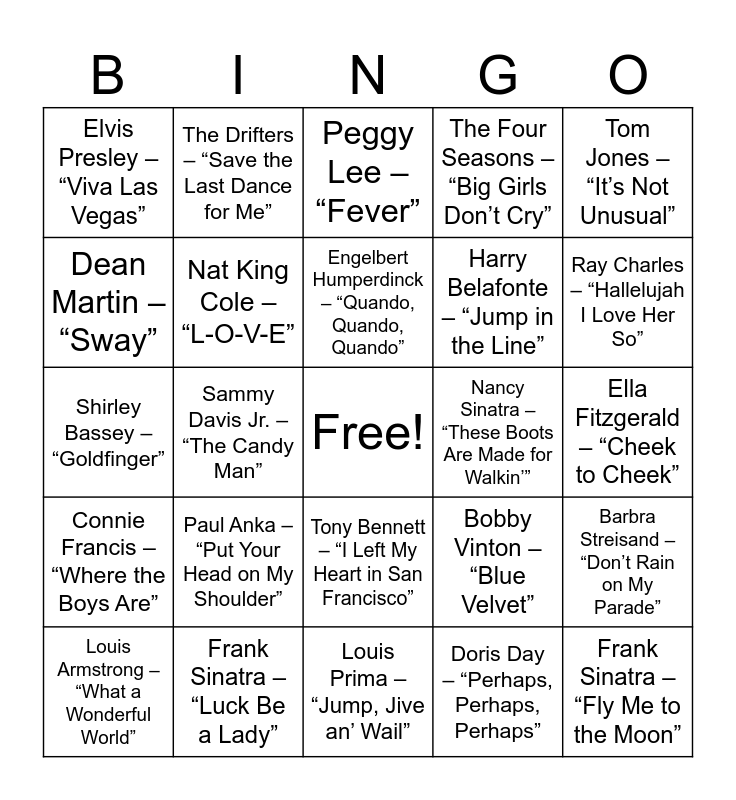 This bingo card has a free space and 30 words: Frank Sinatra – “Luck Be a Lady”, Dean Martin – “Ain’t That a Kick in the Head”, Sammy Davis Jr. – “The Candy Man”, Bobby Darin – “Mack the Knife”, Elvis Presley – “Viva Las Vegas”, Peggy Lee – “Fever”, Nat King Cole – “L-O-V-E”, Tony Bennett – “I Left My Heart in San Francisco”, Nancy Sinatra – “These Boots Are Made for Walkin’”, Louis Prima – “Jump, Jive an’ Wail”, Ella Fitzgerald – “Cheek to Cheek”, Frank Sinatra – “Fly Me to the Moon”, Doris Day – “Perhaps, Perhaps, Perhaps”, The Platters – “The Great Pretender”, Ray Charles – “Hallelujah I Love Her So”, Etta James – “At Last”, Bobby Vinton – “Blue Velvet”, Connie Francis – “Where the Boys Are”, Paul Anka – “Put Your Head on My Shoulder”, Tom Jones – “It’s Not Unusual”, Shirley Bassey – “Goldfinger”, Andy Williams – “Can’t Take My Eyes Off You”, The Drifters – “Save the Last Dance for Me”, Harry Belafonte – “Jump in the Line”, Dean Martin – “Sway”, The Four Seasons – “Big Girls Don’t Cry”, Barbra Streisand – “Don’t Rain on My Parade”, Louis Armstrong – “What a Wonderful World”, Engelbert Humperdinck – “Quando, Quando, Quando” and Frankie Valli – “Can’t Take My Eyes Off You”.