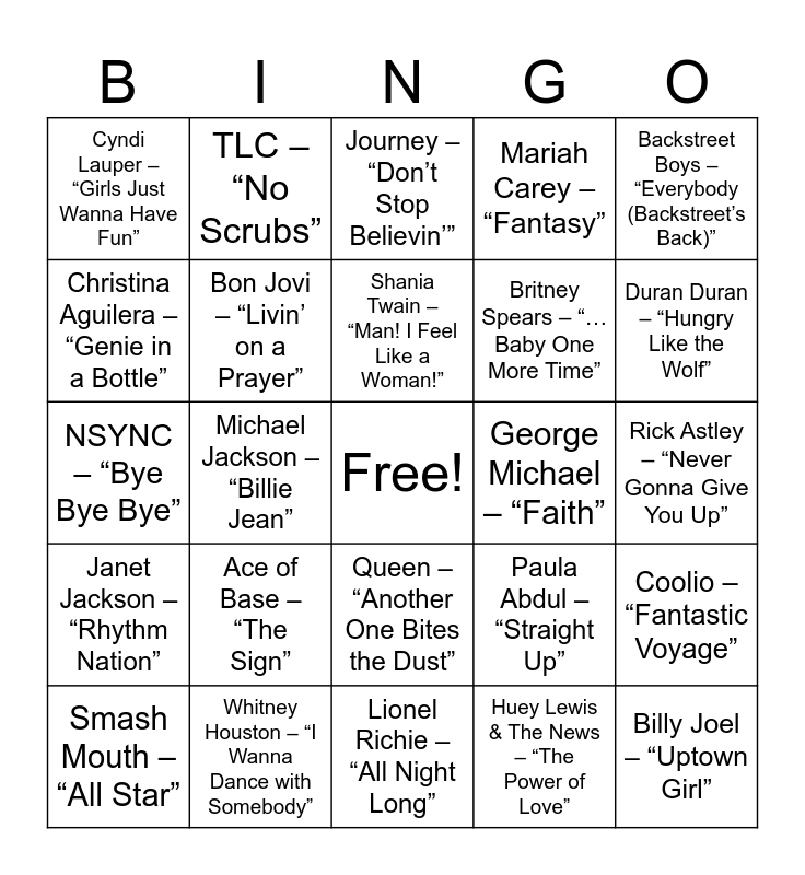 This bingo card has a free space and 30 words: Whitney Houston – “I Wanna Dance with Somebody”, Prince – “Kiss”, Michael Jackson – “Billie Jean”, Madonna – “Material Girl”, Cyndi Lauper – “Girls Just Wanna Have Fun”, Journey – “Don’t Stop Believin’”, Bon Jovi – “Livin’ on a Prayer”, Queen – “Another One Bites the Dust”, George Michael – “Faith”, Lionel Richie – “All Night Long”, Rick Astley – “Never Gonna Give You Up”, Billy Joel – “Uptown Girl”, Huey Lewis & The News – “The Power of Love”, Kenny Loggins – “Footloose”, Duran Duran – “Hungry Like the Wolf”, INXS – “Need You Tonight”, Paula Abdul – “Straight Up”, Janet Jackson – “Rhythm Nation”, Ace of Base – “The Sign”, Backstreet Boys – “Everybody (Backstreet’s Back)”, NSYNC – “Bye Bye Bye”, Spice Girls – “Wannabe”, TLC – “No Scrubs”, Britney Spears – “…Baby One More Time”, Christina Aguilera – “Genie in a Bottle”, Mariah Carey – “Fantasy”, Coolio – “Fantastic Voyage”, Smash Mouth – “All Star”, Shania Twain – “Man! I Feel Like a Woman!” and Ricky Martin – “Livin’ la Vida Loca”.