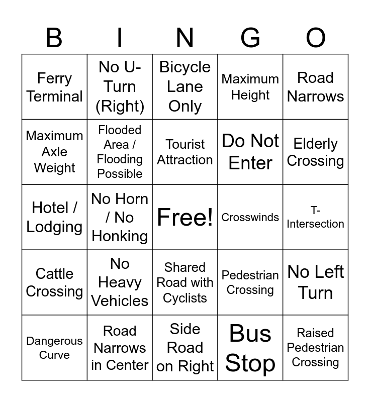 This bingo card has a free space and 118 words: No Stopping or Parking, End of Dual Carriageway, Sharp Left Curve, No Parking, Two-Way Traffic Ahead, No Passing for Trucks, Maximum Height, Public Restrooms, Slippery Road, First Aid, Toll Rates / Toll Information, No U-Turn (Left), No Passing, Turn Left Only, Road Work Ahead, Yield / Give Way, Shared Road with Cyclists, Auto Repair / Mechanic, Highway / Route Marker, Steep Descent, Dangerous Curve, Bicycle Lane Only, Maximum Width, Low Clearance, One-Way Street, Cattle Crossing, Road Narrows in Center, City Entrance / City Limits, No Buses, No Tractors, Elderly Crossing, Tourist Attraction, No Horn / No Honking, Horse Crossing, Straight Ahead Only, Maximum Bridge Load, Tourist Route, Sharp Bend, Drawbridge Ahead, Airport, Winding Road (First Turn Right), Hospital / Emergency Services, Road Narrows on Right, Train Station, Scenic Viewpoint / Lookout, No Bicycles, Bus Stop, Maximum Axle Weight, Falling Rocks, Rough Road, Parking, Crosswinds, Left Curve, Police Station, Public Phone, Maximum Gross Weight, Restaurant, Turn Right Only, Metered Parking / Regulated Parking, Maximum Speed Limit, No Left Turn, Campground, Bus Terminal / Coach Station, Pedestrian Overpass, Farm Machinery Crossing, City Direction Sign, No Right Turn, Flooded Area / Flooding Possible, Hotel / Lodging, Stop Ahead, T-Intersection, District / Neighborhood Direction Sign, Road Narrows on Left, No Motorcycles, No Animal-Drawn Vehicles, No U-Turn (Right), Raised Pedestrian Crossing, No Heavy Vehicles, Ferry Terminal, Pedestrian Zone, Underpass, Y-Intersection, Two-Way Traffic, Direction Confirmation Sign, Pedestrian Crossing, Trucks Only for Loading and Unloading, Do Not Enter, Heavy Vehicles Crossing, Maximum Vehicle Length, Narrow Bridge, Skewed Intersection, Dip, Winding Road (First Turn Left), Side Road on Left, Loose Gravel, Road Narrows, No Animals, Gas Station / Fuel, Stop, Right Curve, Uncontrolled Intersection, Curvy Road Ahead (Right), Dead End / No Outlet, Traffic Signal Ahead, Speed Bump, School Zone, Children Crossing, Railroad Crossing (With Gates), No Trailers, Steep Ascent, Side Road on Right, Pedestrian Crossing Ahead, No Trucks, Railroad Crossing (No Gates), Start of Dual Carriageway, Sharp Right Curve, No Pedestrians and Curvy Road Ahead (Left).
