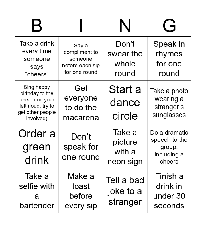This bingo card has 39 words: Free!, Play pool with a stranger, Do a shot, Start a dance circle, Use your non-dominant hand only to hold your drink, Take a photo with someone wearing pink, Take a photo wearing a stranger’s sunglasses, Speak in a fake accent for one round (one drink), Sing happy birthday to the person on your left (loud, try to get other people involved), Finish a drink in under 30 seconds, Do a dramatic speech to the group, including a cheers, Speak in rhymes for one round, Take a selfie with a bartender, Tell a bad joke to a stranger, Make a toast before every sip, Play a round of pool holding your cue backwards, Swap drinks with the person to your right, Take a drink every time someone says “cheers”, Write a poem on a napkin for a bartender, Ask a bartender to rate your dancemove, Get everyone to do the macarena, Get the DJ/staff to play Sweet Caroline, Order a green drink, Don’t speak for one round, Stay sitting for one whole round, Stay outside for one round (everyone else can go inside), Find someone with a dog and tell them you’re a cat person, Give a stranger a compliment, Turn your shirt backwards or inside out, Say a compliment to someone before each sip for one round, Take a photo with someone in a hat, Ask the bartender for their drink recommendation, then order it, Don’t swear the whole round, Convince someone you’re a famous athlete or singer, Call someone’s mum off their phone - if no answer, skull your drink, Get a stranger to teach you a dance move, Do the robot on the dancefloor, Take a picture with a neon sign and Act like a stranger is a celebrity and get their autograph.