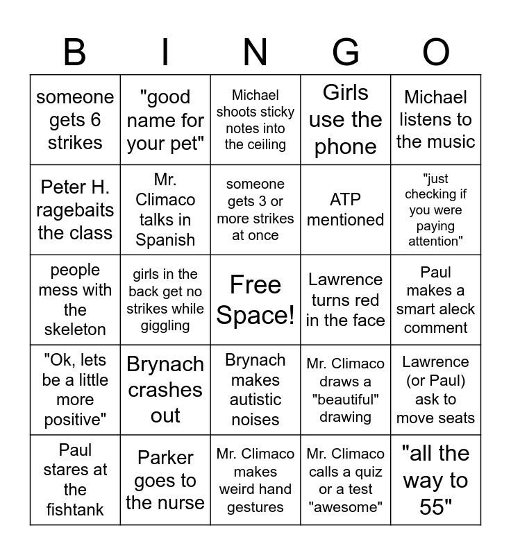This bingo card has a free space and 24 words: Brynach crashes out, Parker goes to the nurse, someone gets 3 or more strikes at once, Paul stares at the fishtank, Michael listens to the music, someone gets 6 strikes, Peter H. ragebaits the class, "good name for your pet", Lawrence turns red in the face, Brynach makes autistic noises, ATP mentioned, people mess with the skeleton, Mr. Climaco draws a "beautiful" drawing, Lawrence (or Paul) ask to move seats, Mr. Climaco talks in Spanish, Mr. Climaco calls a quiz or a test "awesome", Paul makes a smart aleck comment, Michael shoots sticky notes into the ceiling, "just checking if you were paying attention", girls in the back get no strikes while giggling, "all the way to 55", "Ok, lets be a little more positive", Girls use the phone and Mr. Climaco makes weird hand gestures.