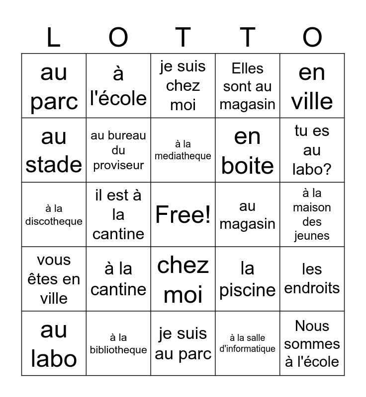 This bingo card has a free space and 24 words: à la cantine, à la bibliotheque, à la mediatheque, au labo, en ville, au parc, au stade, à l'école, au magasin, chez moi, en boite, à la discotheque, la piscine, les endroits, au bureau du proviseur, à la salle d'informatique, à la maison des jeunes, je suis chez moi, tu es au labo?, il est à la cantine, Nous sommes à l'école, vous êtes en ville, Elles sont au magasin and je suis au parc.