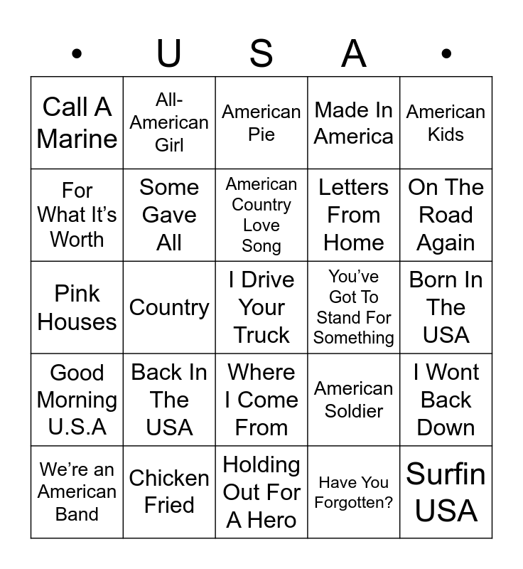 This bingo card has 75 words: God Bless The USA, Only In America, American Pie, American Heart, Where The Stars And Stripes & The Eagle Fly, America The Beautiful, Ragged Old Flag, Danger Zone, Party In The USA, American Saturday Night, Surfin USA, The Battle Of New Orleans, American Country Love Song, For What It’s Worth, R.O.C.K In The U.S.A, Country, American Girl, I Drive Your Truck, If You’re Reading This, American Kids, Travelin Soldier, Pink Houses, Some Gave All, All-American Girl, Made In America, Where Were You, Blue Sky, Red White & Blue, American Honey, 8th Of November, American Woman, Home, Small Town, American Soldier, On The Road Again, Letters From Home, Fortunate Son, Free Bird, Born In The USA, Have You Forgotten?, American Ride, In Color, Courtesy Of The Red White And Blue, Independence Day, Riding With Private Malone, Star Spangled Banner, We’re an American Band, Call A Marine, Living In America, I’ve Been Everywhere, Small Town USA, Where I Come From, Beer For My Horses, I Love My Country, Something To Be Proud Of, God’s Country, Semper Fi, This Land Is Your Land, My Country Tis Of Thee, America Will Survive, Back In The USA, Paradise, Jack & Diane, Lean On Me, Top Gun Anthem, You’ve Got To Stand For Something, The Ones That Didn’t Make It Back Home, This Aint Nothin, It’s America, I Wont Back Down, Good Morning U.S.A, Chicken Fried, I’m Still Standing, Holding Out For A Hero and More Than A Name On A Wall.