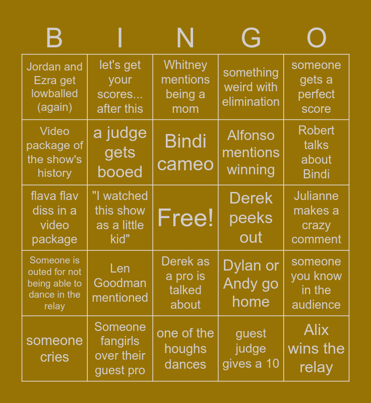 This bingo card has a free space and 24 words: Len Goodman mentioned, Someone fangirls over their guest pro, Bindi cameo, someone cries, someone gets a perfect score, Jordan and Ezra get lowballed (again), Video package of the show's history, let's get your scores... after this, Derek peeks out, Derek as a pro is talked about, Alfonso mentions winning, flava flav diss in a video package, Dylan or Andy go home, someone you know in the audience, a judge gets booed, guest judge gives a 10, Julianne makes a crazy comment, Whitney mentions being a mom, Robert talks about Bindi, "I watched this show as a little kid", Alix wins the relay, Someone is outed for not being able to dance in the relay, something weird with elimination and one of the houghs dances.