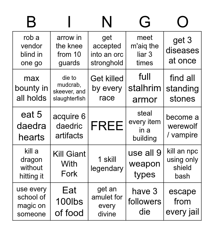 This bingo card has a free space and 24 words: Kill Giant With Fork, Eat 100lbs of food, Get killed by every race, use every school of magic on someone, get 3 diseases at once, rob a vendor blind in one go, max bounty in all holds, arrow in the knee from 10 guards, steal every item in a building, 1 skill legendary, full stalhrim armor, eat 5 daedra hearts, use all 9 weapon types, kill an npc using only shield bash, die to mudcrab, skeever, and slaughterfish, have 3 followers die, become a werewolf / vampire, get accepted into an orc stronghold, find all standing stones, acquire 6 daedric artifacts, escape from every jail, kill a dragon without hitting it, meet m'aiq the liar 3 times and get an amulet for every divine.
