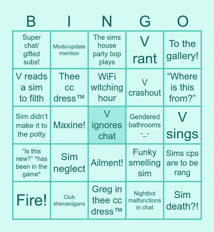 This bingo card has a free space and 38 words: V does an impression, Greg, V mentions the prophecy (bands), Thee cc dress™️, Sims cps are to be rang, Sim neglect, WiFi witching hour, V asks a question and ignores chat, To the gallery!, V crashout, Maxine!, V rant, Sim death?!, V sings, V reads a sim to filth, “Is this new?” *has been in the game*, V does a recording in one take #thespian, The sims house party bop plays, Renovation moment, Gendered bathrooms -_-, Super chat/ gifted subs!, Club shenanigans, “Where is this from?”, Fire!, Bob mention (sponge or burgers), Greg in thee cc dress™️, Struggle bus arrival, Burglary!, Alien abduction?!, Bow-chicka-wow-wow, Fight!, Ailment!, Nightbot malfunctions in chat, Mods/update mention, Sim passes out, Funky smelling sim, Sim didn’t make it to the potty and Sim is starving.