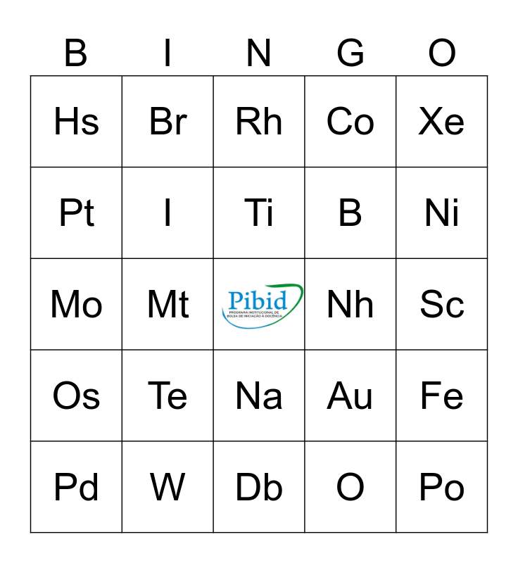 This bingo card has a free space and 91 words: H, Li, Na, K, Rb, Cs, Fr, Be, Mg, Ca, Sr, Ba, Ra, Sc, Y, Ti, Zr, Hf, Rf, V, Nb, Ta, Db, Cr, Mo, W, Sg, Mn, Tc, Re, Bh, Fe, Ru, Os, Hs, Co, Rh, Ir, Mt, Ni, Pd, Pt, Ds, Cu, Ag, Au, Rg, Zn, Cd, Hg, Cn, B, Al, Ga, In, Ti, Nh, C, Si, Ge, Sn, Pb, N, P, As, Sb, Bi, O, S, Se, Te, Po, F, Cl, Br, I, At, He, Ne, Ar, Kr, Xe, Rn, La, Ce, Pr, Nd, Pm, Sm, Eu and Gd.