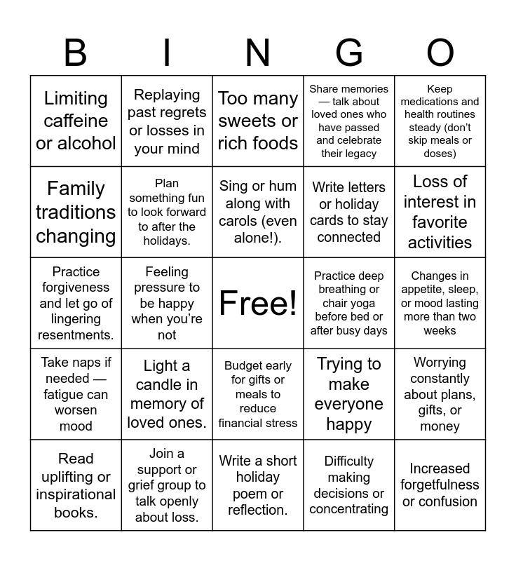 This bingo card has a free space and 160 words: Calling a family member “just to chat”, Attending a holiday event at the senior center, Asking a neighbor for help with errands, Checking your local library for free programs, Visiting a local park or indoor walking track, Hearing holiday songs too early or too often, Not having enough time to prepare, Difficult memories from past holidays, Feeling pressure to buy gifts for everyone, Weather keeping you indoors, Family traditions changing, Unexpected bills or expenses, Too many sweets or rich foods, Watching sad holiday movies, Trying to make everyone happy, Feeling like “it’s just not the same anymore”, Doing one thing at a time (no multitasking), Turning off your phone for quiet time, Making a gratitude list, Watching old favorite shows or movies, Spending time with pets or animals, Taking a nap or rest break, Practicing gentle stretching or chair yoga, Writing down your worries and letting them go, Saying kind things to yourself (“self-compassion”), Planning ahead for meals or shopping, Limiting caffeine or alcohol, Creating a new, simpler holiday tradition, Enjoying nature — even looking out the window, Using humor to lighten the mood, Listening to a relaxation app or guided meditation, Lighting a candle and breathing slowly for one minute, Feeling isolated or withdrawn, Crying easily or feeling on edge, Back pain or stiffness, Frequent colds or getting sick more often, Clenching jaw or grinding teeth, Feeling like you “can’t turn your brain off”, Shortness of breath when upset, Feeling numb or detached, Loss of interest in favorite activities, Being easily startled or jumpy, Feeling like time is rushing or standing still, Feeling increased loneliness or sadness when others seem “busy or happy”, Missing family traditions or deceased loved ones, Feeling like a burden to others, Low motivation to decorate, cook, or celebrate, Worrying about being forgotten or left out, Feeling anxious about travel, weather, or safety, Feeling hopeless or disconnected from the holiday spirit, Crying more often than usual, Feeling guilty about not being able to “do what I used to”, Getting easily irritated or snappy, Difficulty making decisions or concentrating, Feeling overwhelmed by noise, visitors, or change in routine, Withdrawing from social activities or meals, Skipping senior center programs or regular hobbies, Neglecting self-care (bathing, meals, medications), Talking less or seeming distracted, Avoiding phone calls or visitors, Changes in appetite, sleep, or mood lasting more than two weeks, Share memories — talk about loved ones who have passed and celebrate their legacy, Join holiday events at the senior center for companionship and joy, Call or video chat with family or old friends, Reach out to others who might also be alone — helping others reduces loneliness, Write letters or holiday cards to stay connected, Attend a grief support group if holidays bring sadness or loss, Ask for help with decorating, shopping, or cooking — it builds connection, Take short, gentle walks indoors or outdoors to boost mood and circulation, Practice deep breathing or chair yoga before bed or after busy days, Stretch or move every hour to release tension, Listen to calming or favorite holiday music, Use a heating pad or warm bath to ease muscle tension, Take naps if needed — fatigue can worsen mood, Limit caffeine and alcohol, which can affect sleep and mood, Set simple expectations — focus on meaningful moments, not perfection, Budget early for gifts or meals to reduce financial stress, Simplify traditions — one dish instead of a full meal, or one decoration instead of many, Practice gratitude — list 3 small blessings daily, Create a “quiet corner” in your home for peace or prayer, Limit news or social media if it feels overwhelming, Keep medications and health routines steady (don’t skip meals or doses), Plan rest breaks between errands or visits, Laugh often — watch comedies, share jokes, or recall funny holiday memories, Persistent sadness, anxiety, or hopelessness, Trouble functioning day-to-day, Not eating or sleeping for several days, Physical pain or heart symptoms during stress, Feeling like life isn’t worth living → Call 988 (Suicide & Crisis Lifeline), Focus on what you can control, not what you can’t., Simplify traditions — choose the few that bring joy, skip the rest., Set realistic expectations (“It’s okay if things are different this year.”), Forgive yourself and others for small disappointments., Reframe negative thoughts — “I may be alone, but I’m safe and cared for.”, Plan ahead for stressful situations (travel, visits, expenses)., Avoid comparing your holidays to others’., Laugh intentionally — humor reduces stress hormones., Make a small kindness goal (e.g., compliment someone each day)., Celebrate small wins (decorating, attending one event, getting rest), Pray or meditate daily, if part of your beliefs., Attend holiday services or listen to sermons online., Read uplifting or inspirational books., Practice forgiveness and let go of lingering resentments., Light a candle in memory of loved ones., Write down your favorite blessings or life lessons from the year., Reflect on the true meaning of the holidays — connection, gratitude, hope, Do crafts, coloring, or make simple decorations., Bake or cook a small treat for yourself or neighbors., Watch classic holiday movies or comedies., Listen to old favorite songs from your youth., Try a new hobby — painting, puzzles, or adult coloring books., Look through photo albums and share stories., Write a short holiday poem or reflection., Decorate your space — even one small ornament can lift spirits., Sing or hum along with carols (even alone!)., Plan something fun to look forward to after the holidays., Practice slow, deep breathing (in through the nose, out through the mouth)., Try progressive muscle relaxation (tensing a