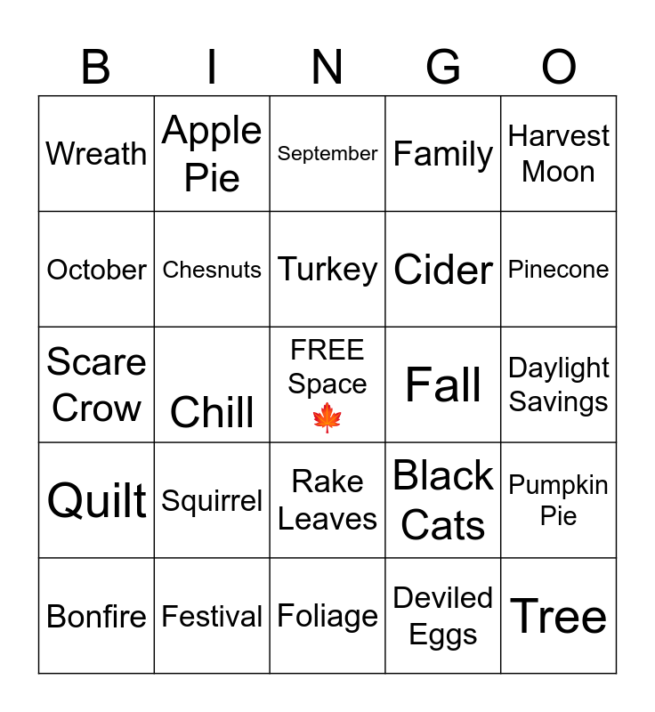 This bingo card has a free space and 29 words: Bonfire, Jack-O-Lantern, Chill, Harvest, Wreath, September, Chesnuts, Squirrel, Fall, Festival, Daylight Savings, Tree, Foliage, Deviled Eggs, Pinecone, Starry Nights, Rake Leaves, Quilt, Harvest Moon, Scare Crow, Black Cats, Chipmunk, Cider, October, Family, Apple Pie, Pumpkin Pie, Turkey and Give Thanks.