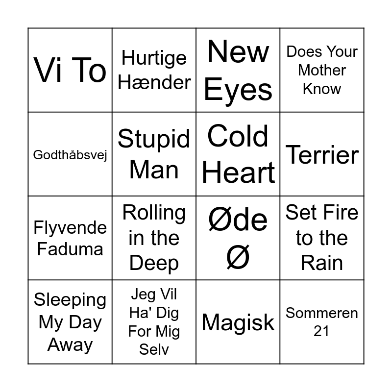 This bingo card has 25 words: Kun For Mig, STOR MAND, Terrier, House ON Fire, Godthåbsvej, Vi To, Stupid Man, Hurtige Hænder, Jeg Vil Ha' Dig For Mig Selv, All My Love, Flyvende Faduma, Øde Ø, Sandheden, Hold Me Closer, Cold Heart, Kommer igen, Magisk, New Eyes, Rolling in the Deep, Set Fire to the Rain, Sleeping My Day Away, Tak For Sidst, Sommeren 21, Does Your Mother Know and Mamma Mia.