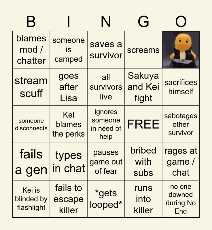 This bingo card has 1 images and 24 words: types in chat, *gets looped*, all survivors live, Kei is blinded by flashlight, blames mod / chatter, stream scuff, someone is camped, FREE, pauses game out of fear, Sakuya and Kei fight, someone disconnects, bribed with subs, rages at game / chat, goes after Lisa, no one downed during No End, sabotages other survivor, saves a survivor, sacrifices himself, Kei blames the perks, ignores someone in need of help, fails to escape killer, fails a gen, screams and runs into killer.