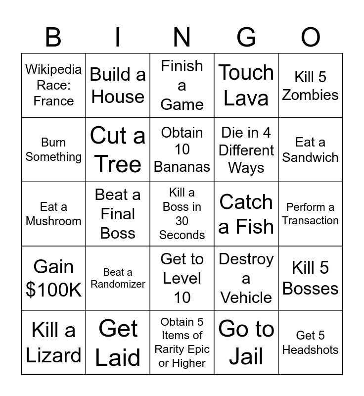 This bingo card has a free space and 24 words: Beat a Randomizer, Get Laid, Obtain 10 Bananas, Kill a Lizard, Kill 5 Zombies, Wikipedia Race: France, Burn Something, Build a House, Catch a Fish, Get to Level 10, Die in 4 Different Ways, Eat a Mushroom, Destroy a Vehicle, Kill 5 Bosses, Cut a Tree, Go to Jail, Perform a Transaction, Finish a Game, Eat a Sandwich, Beat a Final Boss, Get 5 Headshots, Gain $100K, Touch Lava and Obtain 5 Items of Rarity Epic or Higher.