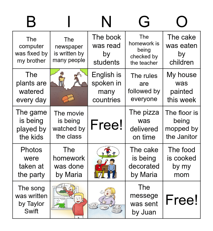 This bingo card has 4 images, a free space and 20 words: The homework was done by Maria, English is spoken in many countries, The song was written by Taylor Swift, The cake was eaten by children, The computer was fixed by my brother, The plants are watered every day, The newspaper is written by many people, The pizza was delivered on time, The rules are followed by everyone, The game is being played by the kids, The cake is being decorated by Maria, The food is cooked by my mom, The messege was sent by Juan, The floor is being mopped by the Janitor, The book was read by students, My house was painted this week, The movie is being watched by the class, Free!, Photos were taken at the party and The homework is being checked by the teacher.