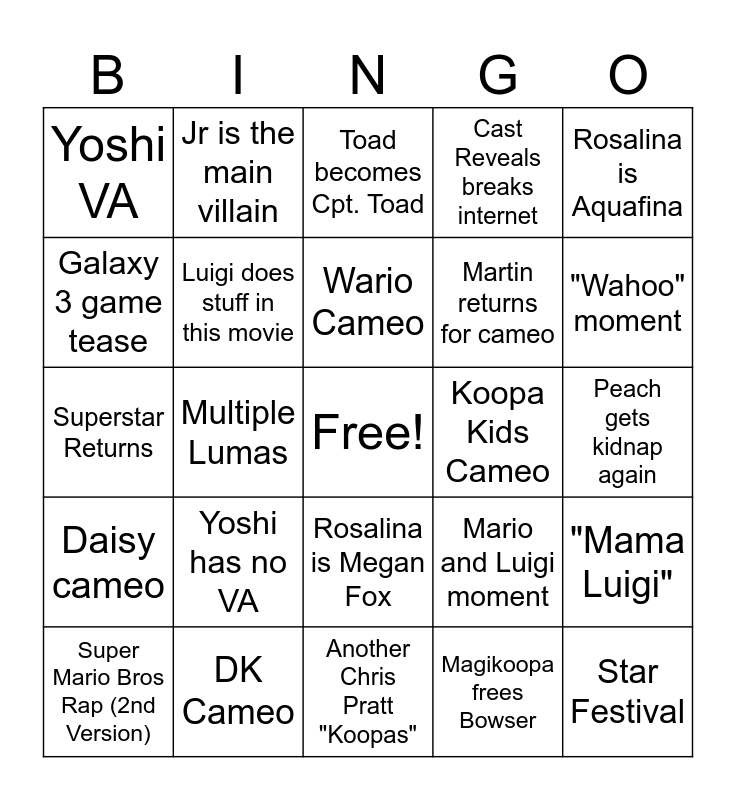 This bingo card has a free space and 24 words: Yoshi has no VA, DK Cameo, Wario Cameo, Super Mario Bros Rap (2nd Version), Rosalina is Aquafina, Yoshi VA, Galaxy 3 game tease, Jr is the main villain, Koopa Kids Cameo, Rosalina is Megan Fox, Martin returns for cameo, Superstar Returns, Mario and Luigi moment, "Mama Luigi", Luigi does stuff in this movie, Magikoopa frees Bowser, Peach gets kidnap again, Toad becomes Cpt. Toad, "Wahoo" moment, Multiple Lumas, Star Festival, Daisy cameo, Cast Reveals breaks internet and Another Chris Pratt "Koopas".