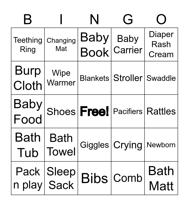 This bingo card has a free space and 38 words: Diapers, Wipes, Baby Monitor, Pacifiers, Rattles, Pack n play, Shoes, Stuffed Animal, Stroller, Diaper Rash Cream, Baby Food, Wipe Warmer, Baby Soap, Swaddle, Burp Cloth, Bath Towel, Wash Rag, Baby Carrier, Newborn, Bath Tub, Changing Mat, Blankets, Crying, High Chair, Formula, Bibs, Crib, Bottle, Mobile, Crawling, Milk, Sleep Sack, Giggles, Teething Ring, Bottle Warmer, Baby Book, Comb and Bath Matt.