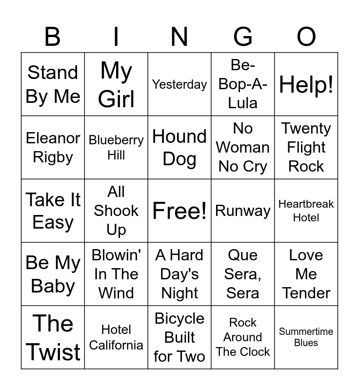 This bingo card has a free space and 29 words: The Twist, Love Me Do, All Shook Up, Sweet Home Alabama, Stand By Me, Yesterday, Blueberry Hill, Blowin' In The Wind, Runway, Hotel California, Heartbreak Hotel, Summertime Blues, Bicycle Built for Two, Rock Around The Clock, Twenty Flight Rock, Brown Eyed Girl, A Hard Day's Night, Be My Baby, Help!, Take It Easy, Que Sera, Sera, Can't Take My Eyes Off You, No Woman No Cry, Eleanor Rigby, Be-Bop-A-Lula, My Girl, Love Me Tender, Hound Dog and Bye Bye Love.