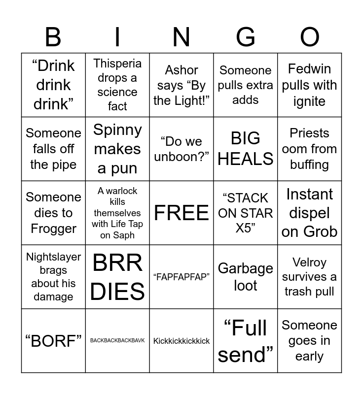 This bingo card has a free space and 24 words: BRR DIES, BACKBACKBACKBAVK, “Do we unboon?”, “BORF”, Fedwin pulls with ignite, “Drink drink drink”, Someone falls off the pipe, Thisperia drops a science fact, “STACK ON STAR X5”, “FAPFAPFAP”, BIG HEALS, Someone dies to Frogger, Garbage loot, Velroy survives a trash pull, Spinny makes a pun, “Full send”, Instant dispel on Grob, Ashor says “By the Light!”, Priests oom from buffing, A warlock kills themselves with Life Tap on Saph, Someone goes in early, Nightslayer brags about his damage, Someone pulls extra adds and Kickkickkickkick.