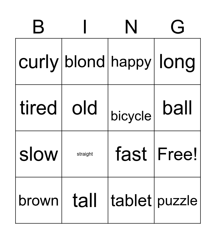 This bingo card has 18 words: straight, puzzle, happy, curly, fast, long, brown, blond, ball, slow, tablet, tired, Free!, old, bicycle, short, tall and young.