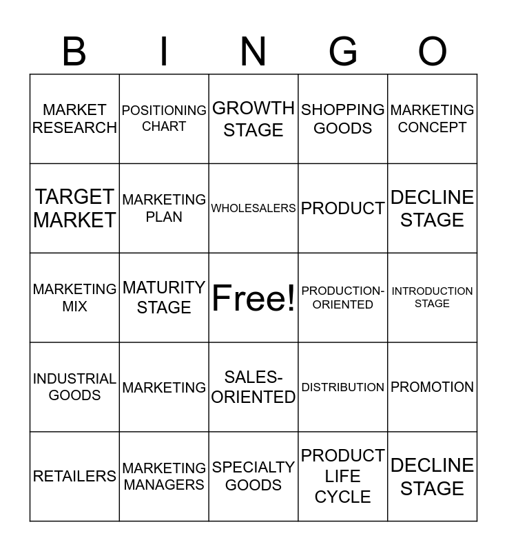 This bingo card has a free space and 24 words: MARKETING, MARKETING MANAGERS, WHOLESALERS, RETAILERS, MARKETING CONCEPT, MARKET RESEARCH, TARGET MARKET, POSITIONING CHART, PRODUCTION-ORIENTED, SALES-ORIENTED, PRODUCT, MARKETING MIX, DISTRIBUTION, PROMOTION, MARKETING PLAN, PRODUCT LIFE CYCLE, INTRODUCTION STAGE, GROWTH STAGE, DECLINE STAGE, MATURITY STAGE, DECLINE STAGE, INDUSTRIAL GOODS, SHOPPING GOODS and SPECIALTY GOODS.