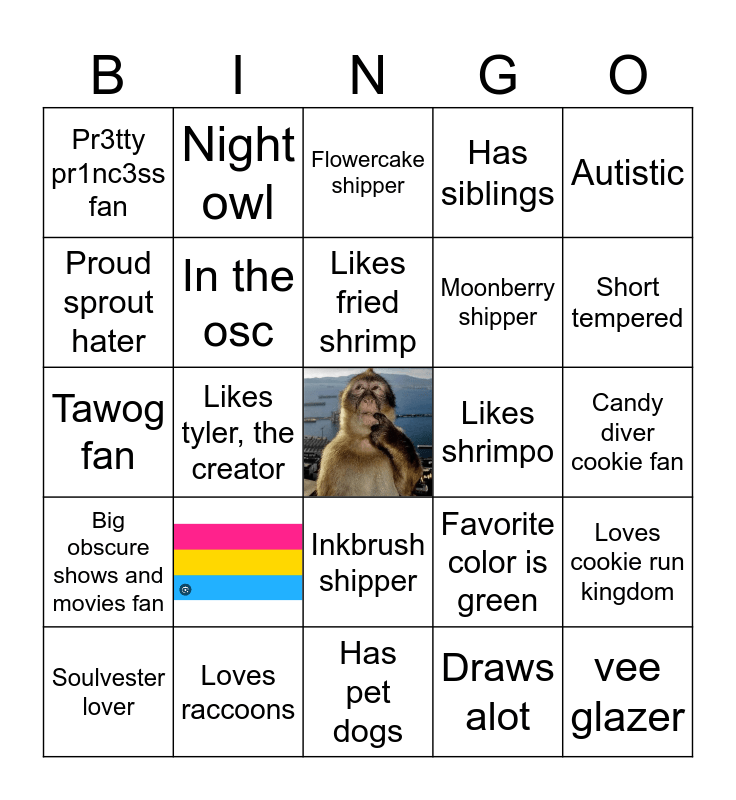 This bingo card has 1 images, a free space and 23 words: Loves raccoons, Likes fried shrimp, Soulvester lover, Autistic, Pr3tty pr1nc3ss fan, Proud sprout hater, Night owl, Likes shrimpo, Inkbrush shipper, Moonberry shipper, Tawog fan, Favorite color is green, Loves cookie run kingdom, In the osc, Draws alot, Candy diver cookie fan, Flowercake shipper, Short tempered, Likes tyler, the creator, vee glazer, Big obscure shows and movies fan, Has siblings and Has pet dogs.