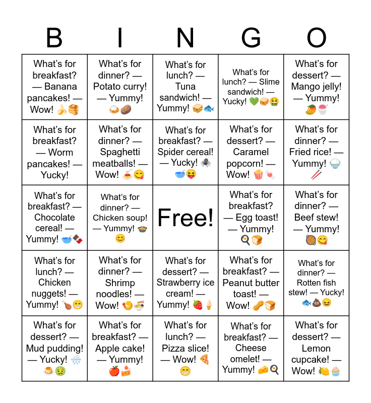 This bingo card has a free space and 30 words: Whatโs for breakfast? โ Apple cake! โ Yummy! ๐๐ฐ, Whatโs for lunch? โ Cheese burger! โ Wow! ๐๐, Whatโs for dinner? โ Chicken soup! โ Yummy! ๐ฒ๐, Whatโs for dessert? โ Chocolate pie! โ Yummy! ๐ซ๐ฅง, Whatโs for breakfast? โ Banana pancakes! โ Wow! ๐๐ฅ, Whatโs for lunch? โ Tuna sandwich! โ Yummy! ๐ฅช๐, Whatโs for dinner? โ Spaghetti meatballs! โ Wow! ๐๐, Whatโs for dessert? โ Strawberry ice cream! โ Yummy! ๐๐ฆ, Whatโs for breakfast? โ Egg toast! โ Yummy! ๐ณ๐, Whatโs for lunch? โ Pizza slice! โ Wow! ๐๐, Whatโs for dinner? โ Beef stew! โ Yummy! ๐ฅ๐, Whatโs for dessert? โ Lemon cupcake! โ Wow! ๐๐ง, Whatโs for breakfast? โ Cheese omelet! โ Yummy! ๐ง๐ณ, Whatโs for lunch? โ Hot dog sandwich! โ Wow! ๐ญ๐, Whatโs for dinner? โ Fried rice! โ Yummy! ๐๐ฅข, Whatโs for dessert? โ Vanilla pudding! โ Yummy! ๐ฎ๐, Whatโs for breakfast? โ Peanut butter toast! โ Wow! ๐ฅ๐, Whatโs for lunch? โ Chicken nuggets! โ Yummy! ๐๐, Whatโs for dinner? โ Shrimp noodles! โ Wow! ๐ค๐, Whatโs for dessert? โ Mango jelly! โ Yummy! ๐ฅญ๐ง, Whatโs for breakfast? โ Chocolate cereal! โ Yummy! ๐ฅฃ๐ซ, Whatโs for lunch? โ Fish burger! โ Wow! ๐ ๐, Whatโs for dinner? โ Potato curry! โ Yummy! ๐๐ฅ, Whatโs for dessert? โ Caramel popcorn! โ Wow! ๐ฟ๐ฌ, Whatโs for breakfast? โ Worm pancakes! โ Yucky!, Whatโs for lunch? โ Slime sandwich! โ Yucky! ๐๐ฅช๐คฎ, Whatโs for dinner? โ Rotten fish stew! โ Yucky! ๐๐ฉ๐, Whatโs for dessert? โ Mud pudding! โ Yucky! ๐ง๏ธ๐ฎ๐คข, Whatโs for breakfast? โ Spider cereal! โ Yucky! ๐ท๏ธ๐ฅฃ๐ and Whatโs for dinner? โ Lizard soup! โ Yucky! ๐ฆ๐ฒ๐คฎ.