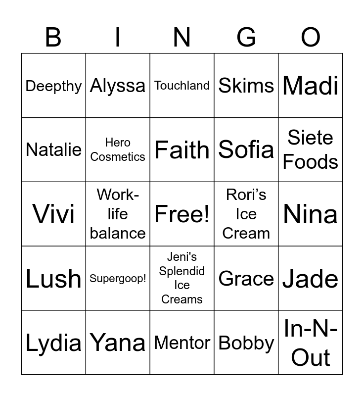 This bingo card has a free space and 26 words: Jeni's Splendid Ice Creams, Bobby, Faith, Yana, Madi, Deepthy, Natalie, Alyssa, Nina, Grace, Sofia, Vivi, Jade, Lydia, Work-life balance, GoMacro, Skims, Lush, Touchland, In-N-Out, Siete Foods, Mentor, Rori’s Ice Cream, Supergoop!, Hero Cosmetics and Jeni's Splendid Ice Creams.