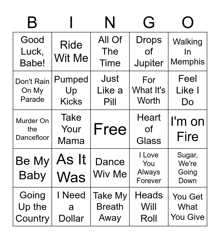 This bingo card has a free space and 38 words: Pretty Little Baby, Thanks fr th Mmrs, I Gotta Feeling, Pumped Up Kicks, Sugar, We're Going Down, As It Was, Just Like a Pill, Give Me One Reason, Walking In Memphis, For What It's Worth, Take Your Mama, Drops of Jupiter, You Get What You Give, I'm on Fire, Don't Rain On My Parade, Be My Baby, I Got U, All Of The Time, Make Your Move, Heart of Glass, Good Luck, Babe!, I Need a Dollar, Feel Like I Do, Going Up the Country, If You Want Me To Stay, Take My Breath Away, Boom, Boom, Boom, Boom!!, Get Your Freak On, Pass That Dutch, Got Your Money, Doo Wop (That Thing), Dance Wiv Me, Heads Will Roll, Ride Wit Me, All of The Lights, I Love You Always Forever, Murder On the Dancefloor and In Too Deep.