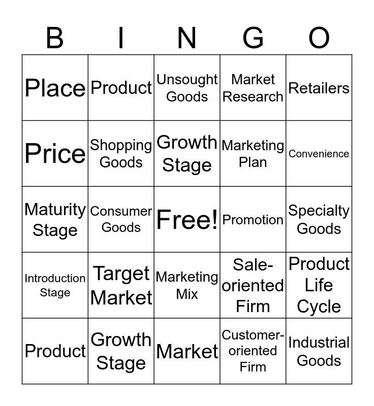 This bingo card has a free space and 25 words: Target Market, Market, Growth Stage, Product, Retailers, Place, Price, Product, Promotion, Marketing Mix, Marketing Plan, Maturity Stage, Sale-oriented Firm, Product Life Cycle, Shopping Goods, Decline Stage, Specialty Goods, Unsought Goods, Convenience, Consumer Goods, Industrial Goods, Growth Stage, Introduction Stage, Market Research and Customer-oriented Firm.