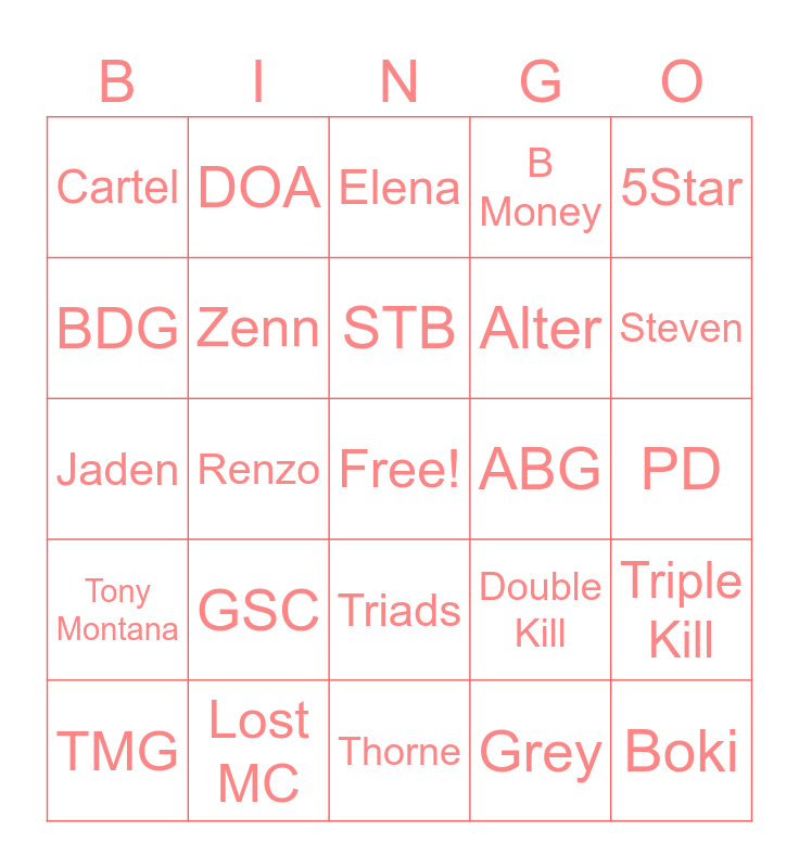 This bingo card has a free space and 24 words: GSC, Lost MC, STB, TMG, 5Star, Cartel, BDG, DOA, ABG, Triads, Alter, Jaden, Double Kill, Triple Kill, Zenn, Grey, PD, Elena, Steven, Renzo, Boki, Tony Montana, B Money and Thorne.