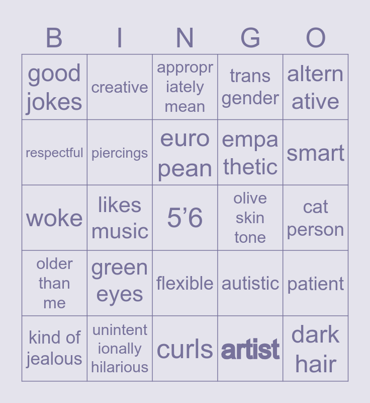 This bingo card has 25 words: green eyes, curls, euro pean, kind of jealous, altern ative, good jokes, respectful, creative, olive skin tone, flexible, empa thetic, woke, autistic, patient, piercings, dark hair, cat person, appropr iately mean, smart, likes music, 5’6, unintent ionally hilarious, older than me, trans gender and artist.
