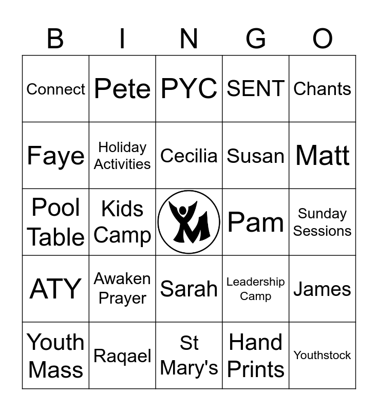 This bingo card has a free space and 28 words: James, YM Bus, Susan, Hand Prints, Faye, PYC, Pete, ATY, Pam, Youth Mass, Pool Table, SENT, Raqael, St Mary's, Matt, Drop In, Awaken Prayer, Holiday Activities, Cecilia, Sarah, Connect, Gayle, Youthstock, Kids Camp, Sunday Sessions, Leadership Camp, Chants and Games.