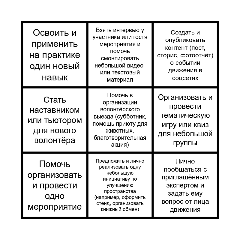 This bingo card has a free space and 9 words: Помочь организовать и провести одно мероприятие, Взять интервью у участника или гостя мероприятия и помочь смонтировать небольшой видео- или текстовый материал, Организовать и провести тематическую игру или квиз для небольшой группы, Освоить и применить на практике один новый навык, Создать и опубликовать контент (пост, сторис, фотоотчёт) о событии движения в соцсетях, Стать наставником или тьютором для нового волонтёра, Предложить и лично реализовать одну небольшую инициативу по улучшению пространства (например, оформить стенд, организовать книжный обмен), Провести небольшую экскурсию по пространству «Первых» для гостей and Лично пообщаться с приглашённым экспертом и задать ему вопрос от лица движения.
