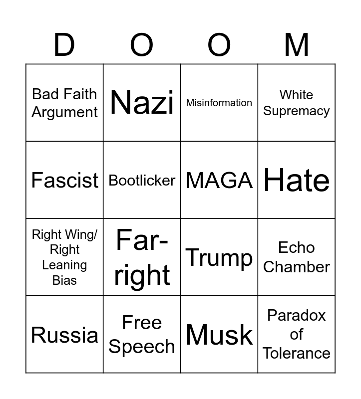 This bingo card has 16 words: Free Speech, Echo Chamber, Misinformation, Bad Faith Argument, Right Wing/ Right Leaning Bias, Nazi, Trump, Musk, Fascist, Bootlicker, Russia, White Supremacy, Far-right, Hate, MAGA and Paradox of Tolerance.