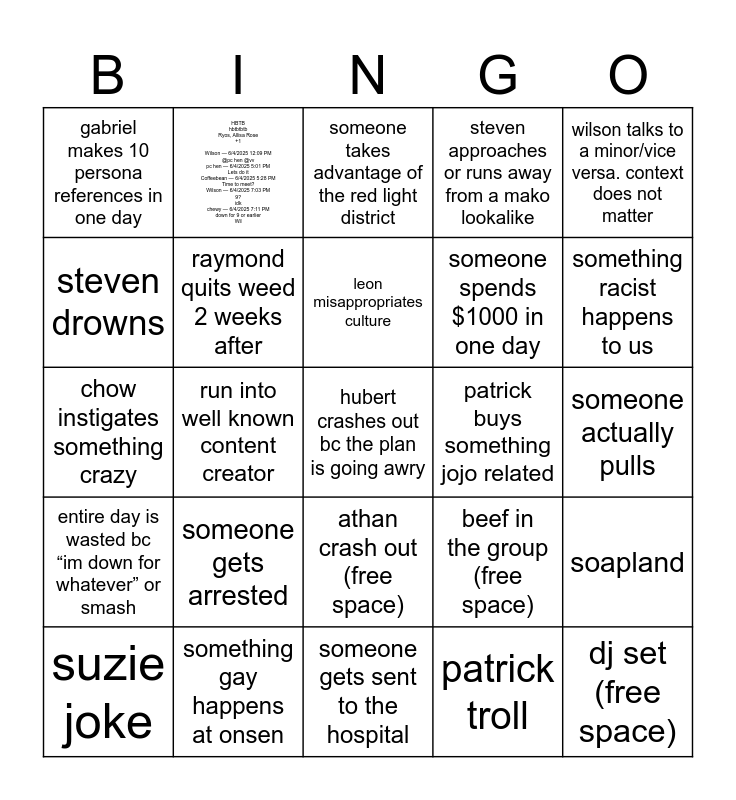 This bingo card has a free space and 35 words: raymond throw up, is raymond even awake?, raymond solo walk, raymond quits weed 2 weeks after, athan crash out (free space), steven approaches or runs away from a mako lookalike, steven drowns, leon gets lost (women’s train), leon misappropriates culture, 40 minute leon shower, chow instigates something crazy, wilson talks to a minor/vice versa. context does not matter, hubert attempts to rizz by speaking japanese, gabriel spends at least $150 on k on/bocchi, gabriel makes 10 persona references in one day, patrick buys something jojo related, patrick troll, run into well known content creator, entire day is wasted bc “im down for whatever” or smash, dj set (free space), beef in the group (free space), suzie joke, soapland, something gay happens at onsen, someone takes advantage of the red light district, something racist happens to us, someone goes broke, someone gets caught gooning, someone spends $1000 in one day, someone actually pulls, someone cracks, someone gets sent to the hospital, someone gets arrested, HBTB hbtbtbtb Ryos, Allisa Rose +1 Wilson — 6/4/2025 12:09 PM @pc hen @vv pc hen — 6/4/2025 5:01 PM Lets do it Coffeebean — 6/4/2025 5:28 PM Time to meet? Wilson — 6/4/2025 7:03 PM 9? idk chewy — 6/4/2025 7:11 PM down for 9 or earlier Wil and "i'm gonna kill/i want to kill...".