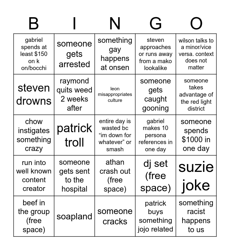 This bingo card has 35 words: raymond throw up, is raymond even awake?, raymond solo walk, raymond quits weed 2 weeks after, athan crash out (free space), steven approaches or runs away from a mako lookalike, steven drowns, leon gets lost (women’s train), leon misappropriates culture, 40 minute leon shower, chow instigates something crazy, wilson talks to a minor/vice versa. context does not matter, hubert crashes out bc the plan is going awry, hubert attempts to rizz by speaking japanese, gabriel spends at least $150 on k on/bocchi, gabriel makes 10 persona references in one day, patrick buys something jojo related, patrick troll, run into well known content creator, entire day is wasted bc “im down for whatever” or smash, dj set (free space), beef in the group (free space), suzie joke, soapland, something gay happens at onsen, someone takes advantage of the red light district, something racist happens to us, someone goes broke, someone gets caught gooning, someone spends $1000 in one day, someone actually pulls, someone cracks, someone gets sent to the hospital, someone gets arrested and "i'm gonna kill/i want to kill...".