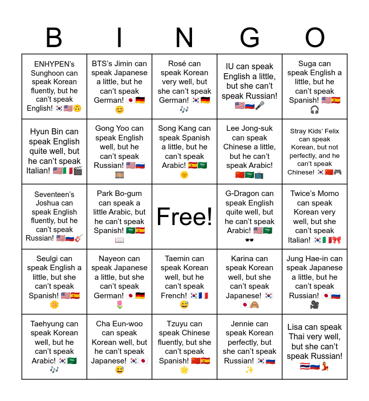 This bingo card has a free space and 44 words: Jungkook can speak English, but he canโt speak Spanish! ๐บ๐ธ๐ช๐ธ๐ค, Lisa can speak Thai very well, but she canโt speak Russian! ๐น๐ญ๐ท๐บ๐, Jisoo can speak Japanese a little, but she canโt speak French! ๐ฏ๐ต๐ซ๐ท๐ธ, Taehyung can speak Korean well, but he canโt speak Arabic! ๐ฐ๐ท๐ธ๐ฆ๐ถ, RM can speak English fluently, but he canโt speak Italian! ๐บ๐ธ๐ฎ๐น๐ง , Jennie can speak Korean perfectly, but she canโt speak Russian! ๐ฐ๐ท๐ท๐บโจ, Rosรฉ can speak Korean very well, but she canโt speak German! ๐ฐ๐ท๐ฉ๐ช๐ถ, Jin can speak Korean very well, but he canโt speak Chinese! ๐ฐ๐ท๐จ๐ณ๐, Suga can speak English a little, but he canโt speak Spanish! ๐บ๐ธ๐ช๐ธ๐ง, Cha Eun-woo can speak Korean well, but he canโt speak Japanese! ๐ฐ๐ท๐ฏ๐ต๐ , IU can speak English a little, but she canโt speak Russian! ๐บ๐ธ๐ท๐บ๐ค, G-Dragon can speak English quite well, but he canโt speak Arabic! ๐บ๐ธ๐ธ๐ฆ๐ถ๏ธ, Taemin can speak Korean well, but he canโt speak French! ๐ฐ๐ท๐ซ๐ท๐ , Nayeon can speak Japanese a little, but she canโt speak German! ๐ฏ๐ต๐ฉ๐ช๐ท, Sana can speak Korean very well, but she canโt speak Italian! ๐ฐ๐ท๐ฎ๐น๐, Tzuyu can speak Chinese fluently, but she canโt speak Spanish! ๐จ๐ณ๐ช๐ธ๐, Heechul can speak English a little, but he canโt speak Arabic! ๐บ๐ธ๐ธ๐ฆ๐, Seventeenโs Joshua can speak English fluently, but he canโt speak Russian! ๐บ๐ธ๐ท๐บ๐ธ, Blackpinkโs Lisa can speak Korean very well, but she canโt speak French! ๐ฐ๐ท๐ซ๐ท๐ฅ, Stray Kidsโ Felix can speak Korean, but not perfectly, and he canโt speak Chinese! ๐ฐ๐ท๐จ๐ณ๐ฎ, BTSโs Jimin can speak Japanese a little, but he canโt speak German! ๐ฏ๐ต๐ฉ๐ช๐, NewJeansโ Hanni can speak Vietnamese a little, but she canโt speak Spanish! ๐ป๐ณ๐ช๐ธ๐ผ, Le Sserafimโs Sakura can speak Korean well, but she canโt speak Arabic! ๐ฐ๐ท๐ธ๐ฆ๐ธ, ENHYPENโs Sunghoon can speak Korean fluently, but he canโt speak English! ๐ฐ๐ท๐บ๐ธ๐, TXTโs Huening Kai can speak English fluently, but he canโt speak Russian! ๐บ๐ธ๐ท๐บ๐น, Twiceโs Momo can speak Korean very well, but she canโt speak Italian! ๐ฐ๐ท๐ฎ๐น๐, Taeyeon can speak English a little, but she canโt speak French! ๐บ๐ธ๐ซ๐ท๐ต, Kai can speak Korean well, but he canโt speak Chinese! ๐ฐ๐ท๐จ๐ณ๐ , Karina can speak Korean well, but she canโt speak Japanese! ๐ฐ๐ท๐ฏ๐ต๐, Seulgi can speak English a little, but she canโt speak Spanish! ๐บ๐ธ๐ช๐ธ๐ผ, Han So-hee can speak Korean beautifully, but she canโt speak English! ๐ฐ๐ท๐บ๐ธ๐ฌ, Jung Hae-in can speak Japanese a little, but he canโt speak Russian! ๐ฏ๐ต๐ท๐บ๐ฅ, Minho can speak English a little, but he canโt speak Italian! ๐บ๐ธ๐ฎ๐นโฝ, Psy can speak English well, but he canโt speak French! ๐บ๐ธ๐ซ๐ท๐ค, Park Bo-gum can speak a little Arabic, but he canโt speak Spanish! ๐ธ๐ฆ๐ช๐ธ๐, Lee Seung-gi can speak a bit of Italian, but he canโt speak Russian! ๐ฎ๐น๐ท๐บ๐, Kim Tae-ri can speak a little German, but she canโt speak Arabic! ๐ฉ๐ช๐ธ๐ฆ๐, Yoo Ah-in can speak a few Russian phrases, but he canโt speak French! ๐ท๐บ๐ซ๐ท๐ญ, Song Kang can speak Spanish a little, but he canโt speak Arabic! ๐ช๐ธ๐ธ๐ฆ๐, Hyun Bin can speak English quite well, but he canโt speak Italian! ๐บ๐ธ๐ฎ๐น๐ฌ, Lee Jong-suk can speak Chinese a little, but he canโt speak Arabic! ๐จ๐ณ๐ธ๐ฆ๐บ, Park Seo-joon can speak Japanese a little, but he canโt speak German! ๐ฏ๐ต๐ฉ๐ช๐ฅ, Gong Yoo can speak English well, but he canโt speak Russian! ๐บ๐ธ๐ท๐บ๐๏ธ and Nam Joo-hyuk can speak Korean very well, but he canโt speak French! ๐ฐ๐ท๐ซ๐ท๐ .