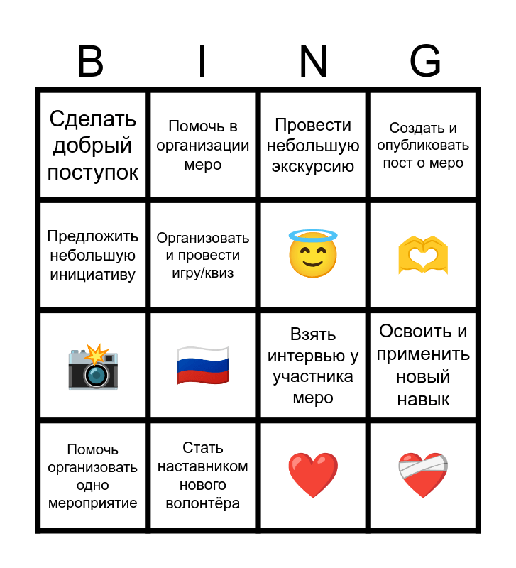 This bingo card has 16 words: Помочь организовать одно мероприятие, Стать наставником нового волонтёра, Провести небольшую экскурсию, Создать и опубликовать пост о меро, Предложить небольшую инициативу, Помочь в организации меро, Взять интервью у участника меро, Освоить и применить новый навык, Сделать добрый поступок, Организовать и провести игру/квиз, ❤️, 🫶, 📸, 🇷🇺, 😇 and ❤️🩹.