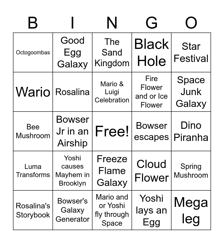 This bingo card has a free space and 24 words: Yoshi causes Mayhem in Brooklyn, Bowser's Galaxy Generator, Mario & Luigi Celebration, Rosalina's Storybook, Star Festival, Octogoombas, Wario, Good Egg Galaxy, Bowser escapes, Freeze Flame Galaxy, Fire Flower and or Ice Flower, Bee Mushroom, Cloud Flower, Spring Mushroom, Rosalina, Yoshi lays an Egg, Dino Piranha, The Sand Kingdom, Space Junk Galaxy, Bowser Jr in an Airship, Mega leg, Luma Transforms, Black Hole and Mario and or Yoshi fly through Space.