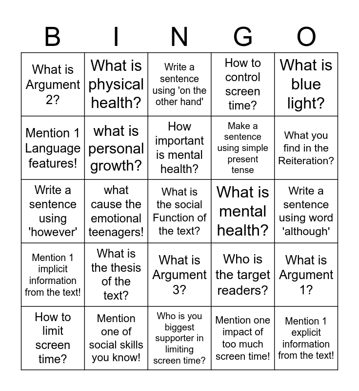 This bingo card has a free space and 24 words: What is the thesis of the text?, Mention one of social skills you know!, How important is mental health?, How to limit screen time?, What is blue light?, What is Argument 2?, Mention 1 Language features!, What is physical health?, What is mental health?, What is Argument 3?, Make a sentence using simple present tense, Write a sentence using 'however', Who is the target readers?, What is Argument 1?, what is personal growth?, Mention one impact of too much screen time!, Write a sentence using word 'although', Write a sentence using 'on the other hand', What you find in the Reiteration?, what cause the emotional teenagers!, Mention 1 explicit information from the text!, Mention 1 implicit information from the text!, How to control screen time? and Who is you biggest supporter in limiting screen time?.