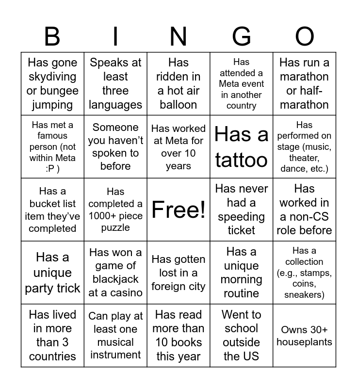 This bingo card has a free space and 24 words: Has won a game of blackjack at a casino, Can play at least one musical instrument, Has worked at Meta for over 10 years, Has lived in more than 3 countries, Has run a marathon or half-marathon, Has gone skydiving or bungee jumping, Has met a famous person (not within Meta :P ), Speaks at least three languages, Has never had a speeding ticket, Has gotten lost in a foreign city, Has a tattoo, Has a bucket list item they’ve completed, Has a unique morning routine, Has a collection (e.g., stamps, coins, sneakers), Someone you haven’t spoken to before, Went to school outside the US, Has worked in a non-CS role before, Has ridden in a hot air balloon, Has performed on stage (music, theater, dance, etc.), Has completed a 1000+ piece puzzle, Owns 30+ houseplants, Has a unique party trick, Has attended a Meta event in another country and Has read more than 10 books this year.