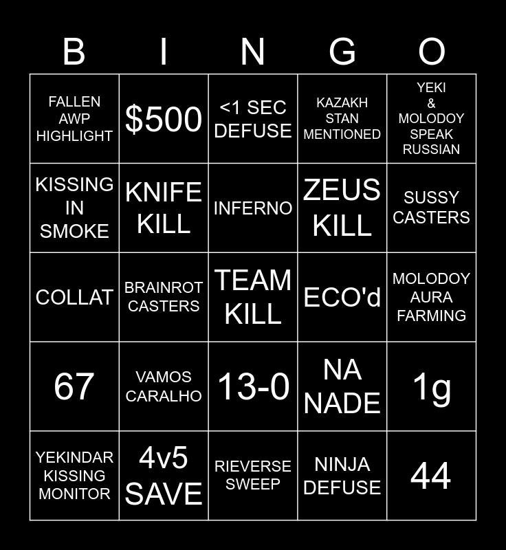 This bingo card has a free space and 24 words: VAMOS CARALHO, 4v5 SAVE, INFERNO, YEKINDAR KISSING MONITOR, YEKI & MOLODOY SPEAK RUSSIAN, FALLEN AWP HIGHLIGHT, KISSING IN SMOKE, $500, ECO'd, 13-0, ZEUS KILL, COLLAT, NA NADE, 1g, KNIFE KILL, NINJA DEFUSE, MOLODOY AURA FARMING, <1 SEC DEFUSE, SUSSY CASTERS, BRAINROT CASTERS, 44, 67, KAZAKH STAN MENTIONED and RIEVERSE SWEEP.