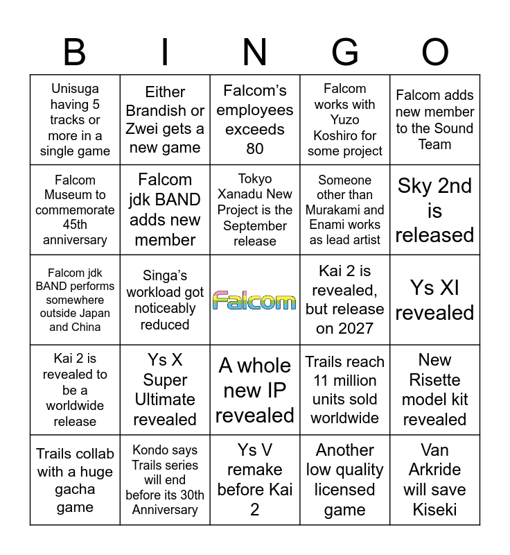 This bingo card has a free space and 24 words: Ys X Super Ultimate revealed, Kondo says Trails series will end before its 30th Anniversary, Tokyo Xanadu New Project is the September release, Trails collab with a huge gacha game, Falcom adds new member to the Sound Team, Unisuga having 5 tracks or more in a single game, Falcom Museum to commemorate 45th anniversary, Either Brandish or Zwei gets a new game, Kai 2 is revealed, but release on 2027, A whole new IP revealed, Someone other than Murakami and Enami works as lead artist, Falcom jdk BAND performs somewhere outside Japan and China, Trails reach 11 million units sold worldwide, New Risette model kit revealed, Falcom jdk BAND adds new member, Another low quality licensed game, Ys XI revealed, Falcom’s employees exceeds 80, Sky 2nd is released, Singa’s workload got noticeably reduced, Van Arkride will save Kiseki, Kai 2 is revealed to be a worldwide release, Falcom works with Yuzo Koshiro for some project and Ys V remake before Kai 2.