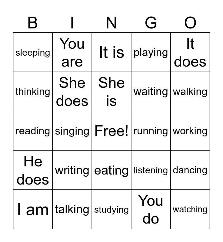 This bingo card has a free space and 34 words: I do, You do, We do, They do, He does, She does, It does, I am, You are, He is, She is, It is, We are, They are, running, walking, talking, reading, writing, listening, eating, drinking, sleeping, working, studying, watching, playing, learning, waiting, thinking, driving, singing, dancing and cooking.
