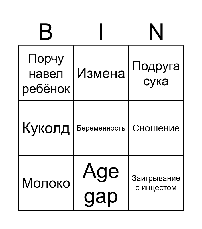 This bingo card has 9 words: Молоко, Подруга сука, Измена, Куколд, Порчу навел ребёнок, Сношение, Беременность, Заигрывание с инцестом and Age gap.